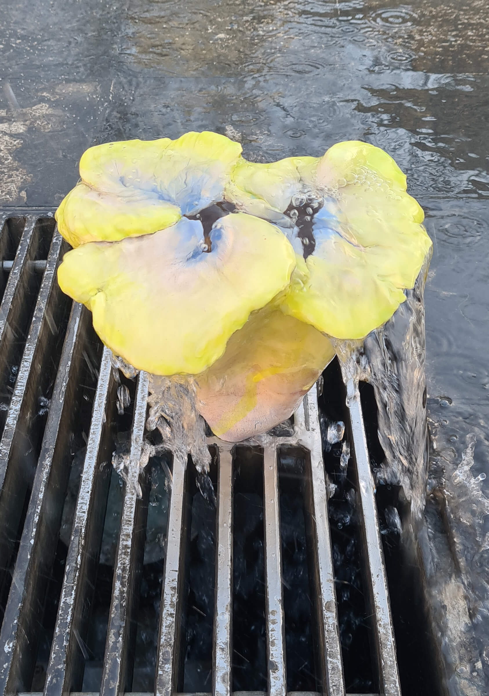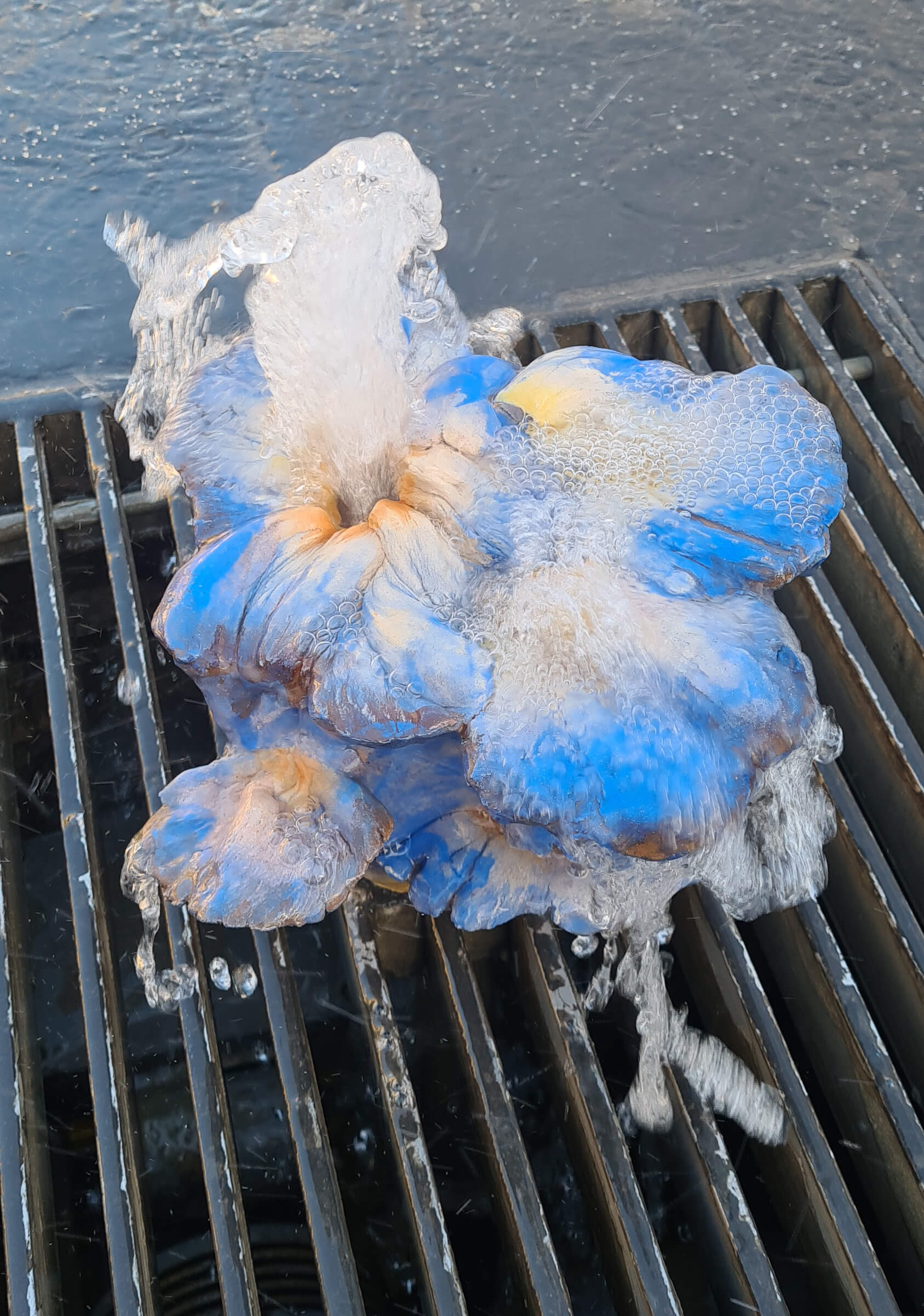 « Algae n°1 et n°2 » Accessoires pour une « plomberie poétique » : céramiques émaillées positionnées sur jets standards, Montpellier, janvier 2024.