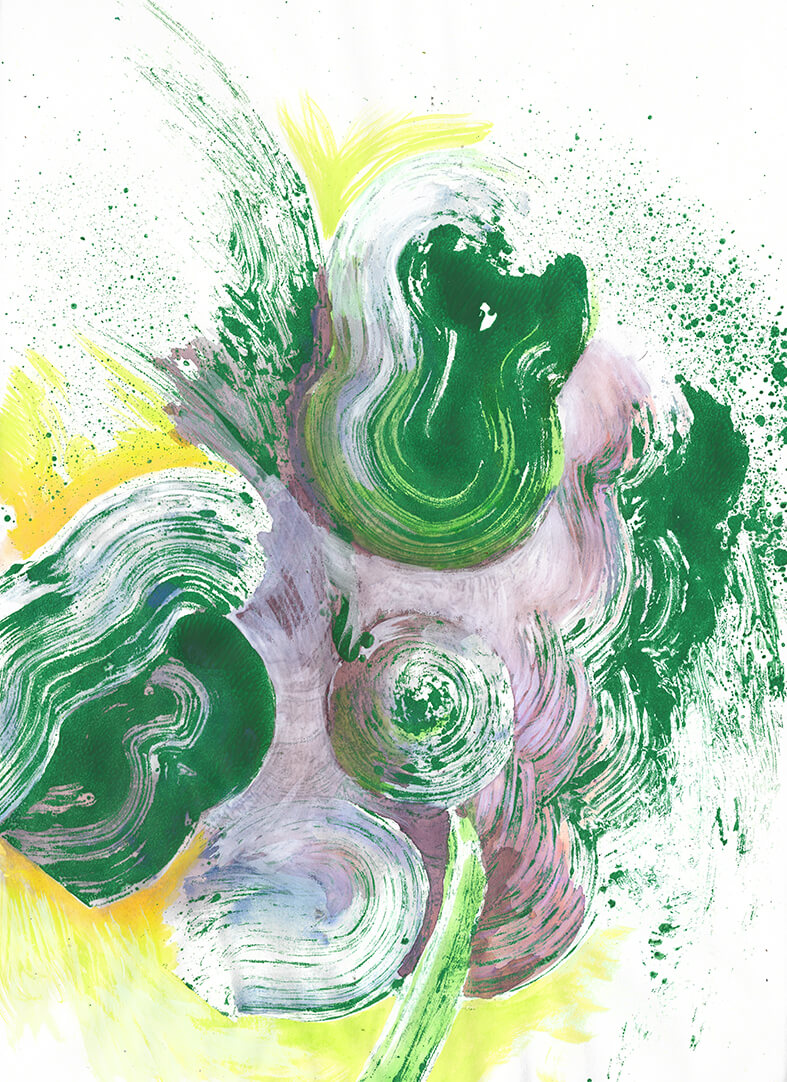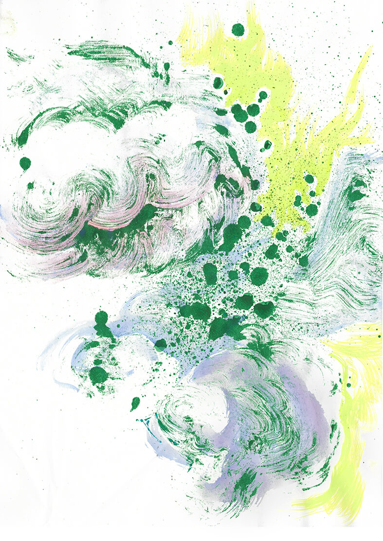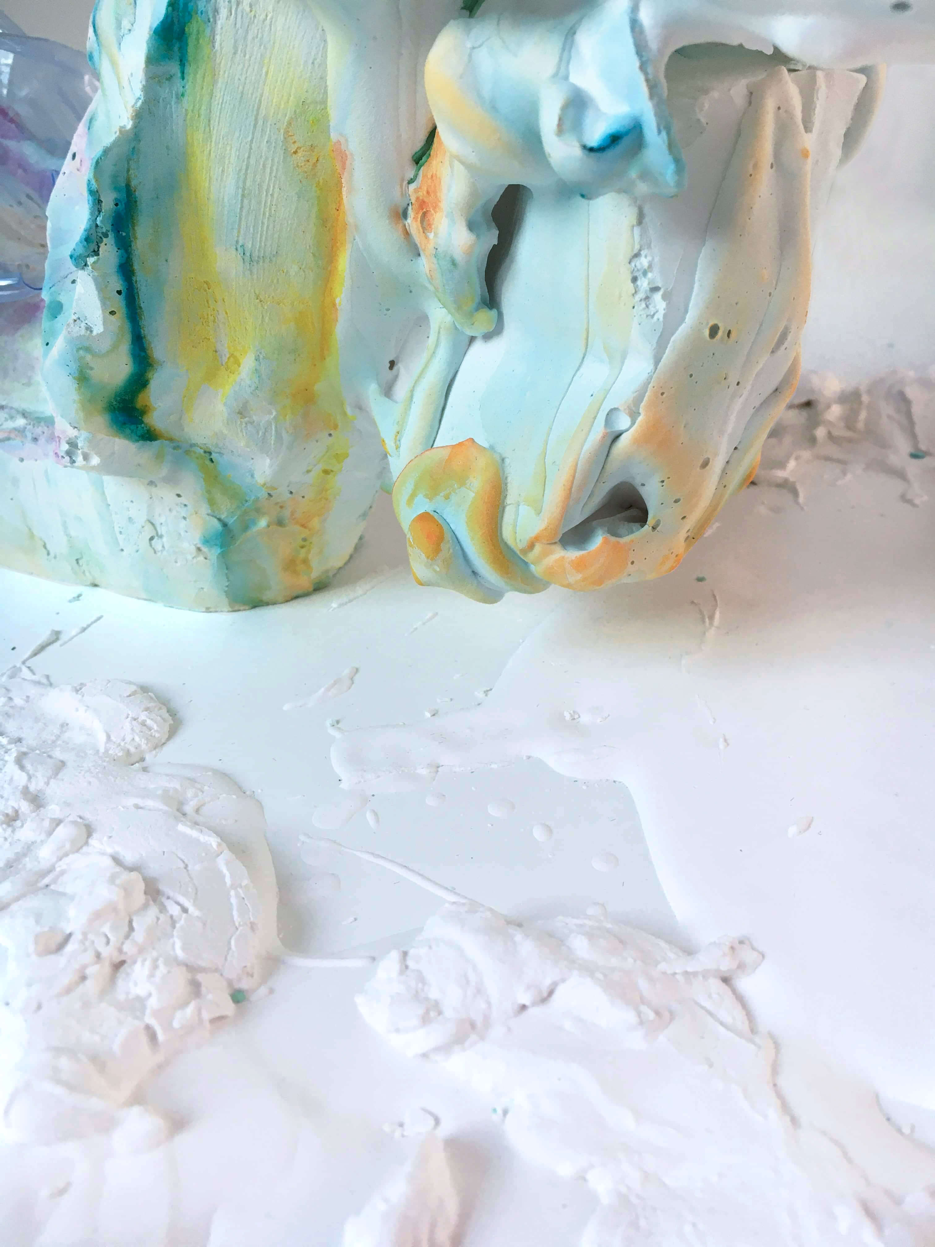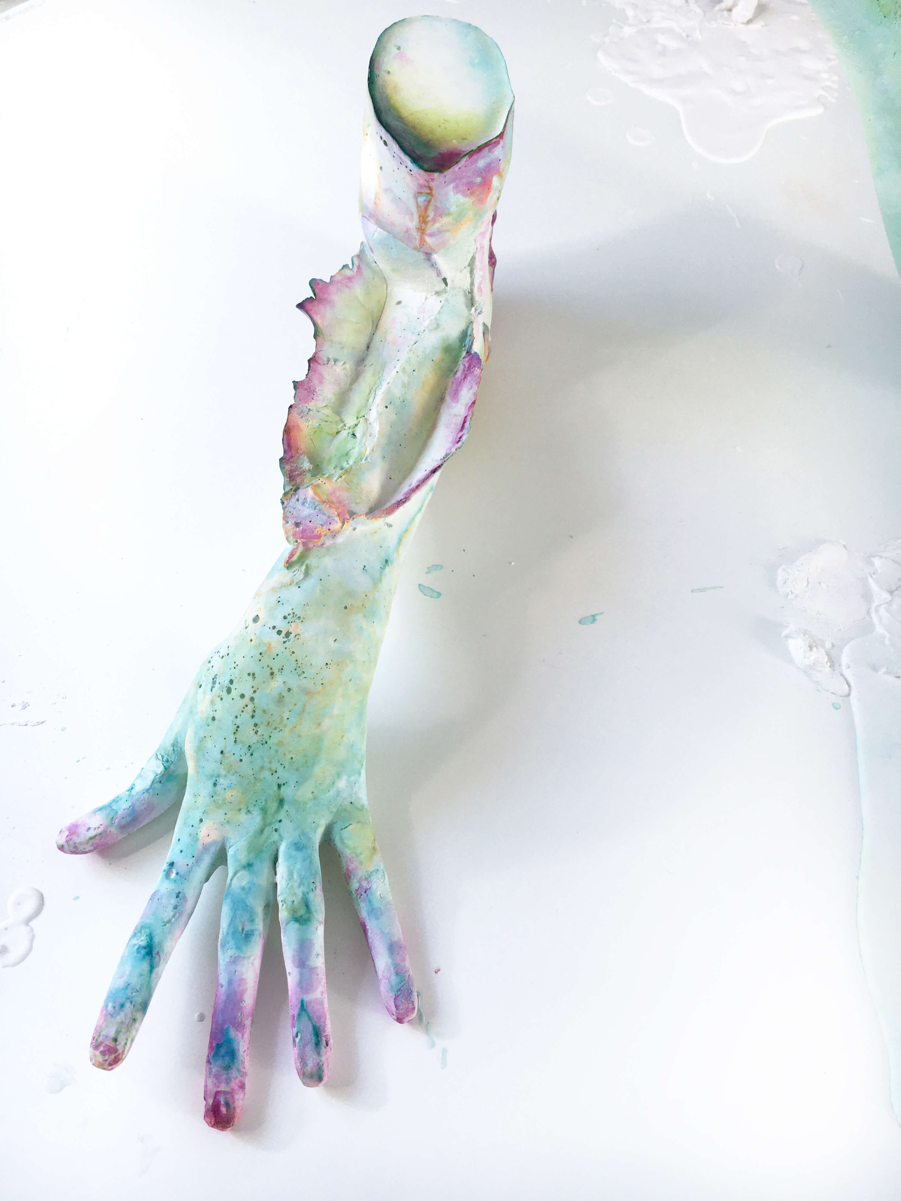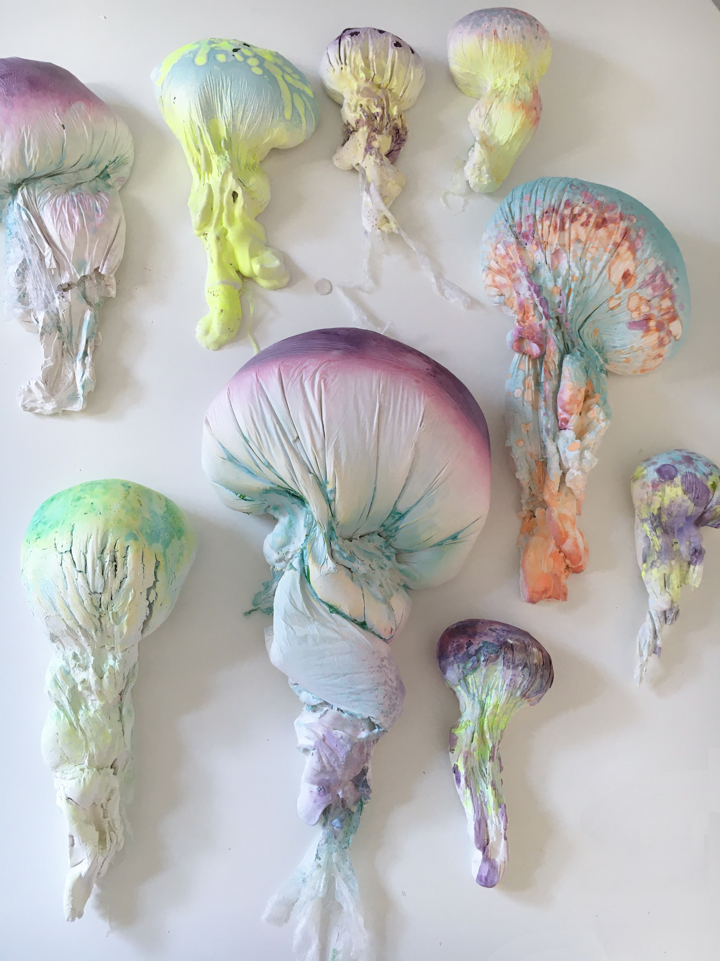 Pour répondre à cette curieuse idée de l’identité alors que nous sommes des êtres en évolution constante, je choisis Protée, les nudibranches et les céphalopodes comme animaux totems. Tel un céphalopode, le dieu Protée se métamorphose selon ses amours et ses humeurs. Ainsi, des fragments de corps comme des êtres vivants autonomes nous représentent sous des couleurs fraiches et flatteuses. Nous, êtres perméables, fruits d’un écosystème toujours fluide et changeant nous abîmons sous la surface, entre les eaux, là où les frontières sont troubles.