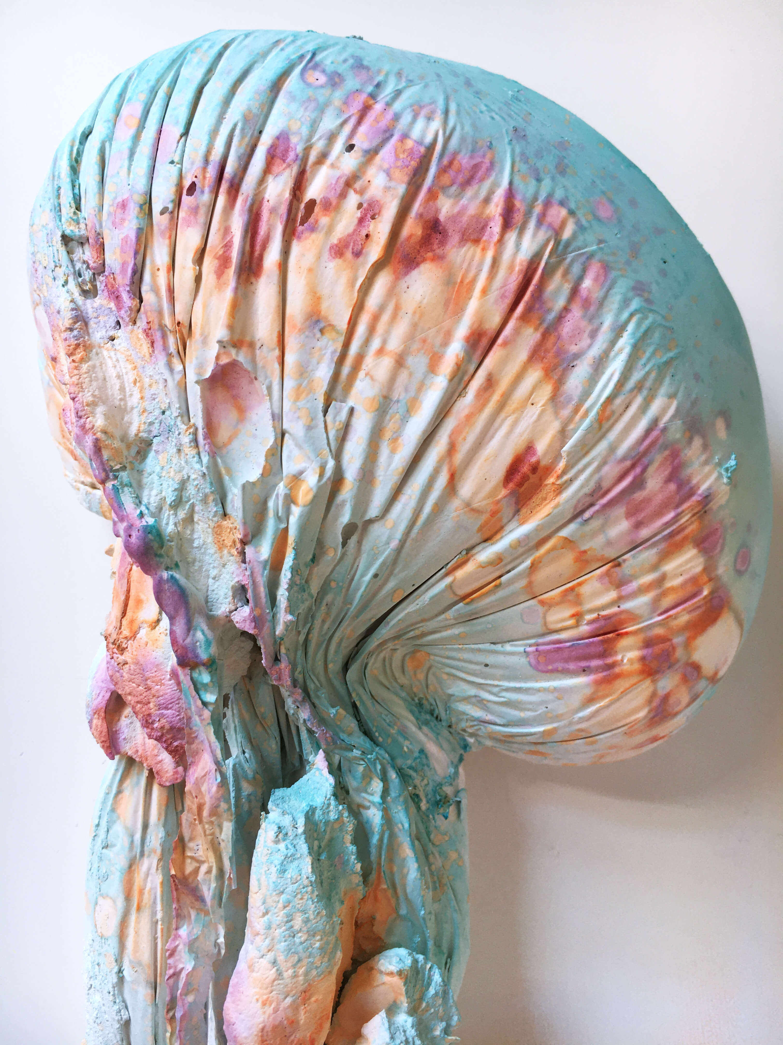 Les pastels et lavis, fugaces, affleurent à la surface du plâtre : un écho du chatoiement des abysses qui, en suspension, disparait de la robe de l’animal lorsque qu’on le sort de l’eau.